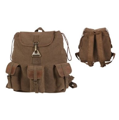 | Rothco's 9693 Brown Vintage Wayfarer Backpack with leather accents is constructed of heavyweight cotton canvas with a leather bottom. It large main compartment features a drawstring top and a top flap closure. |